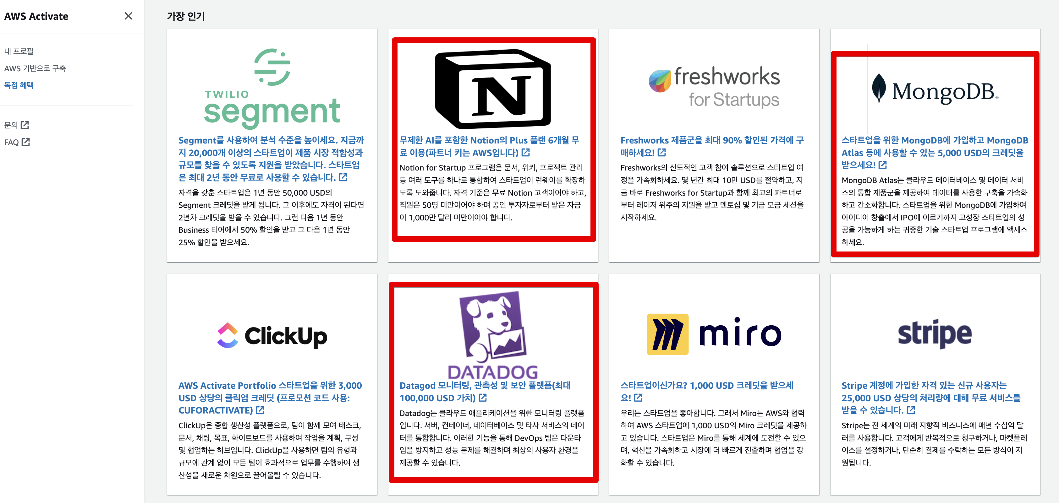 여기서 중요한 것은 Activate 가 되면, 아래 SaaS들을 포함하여 다양한 서비스들의 크레딧과 특전을 받을 수 있다.