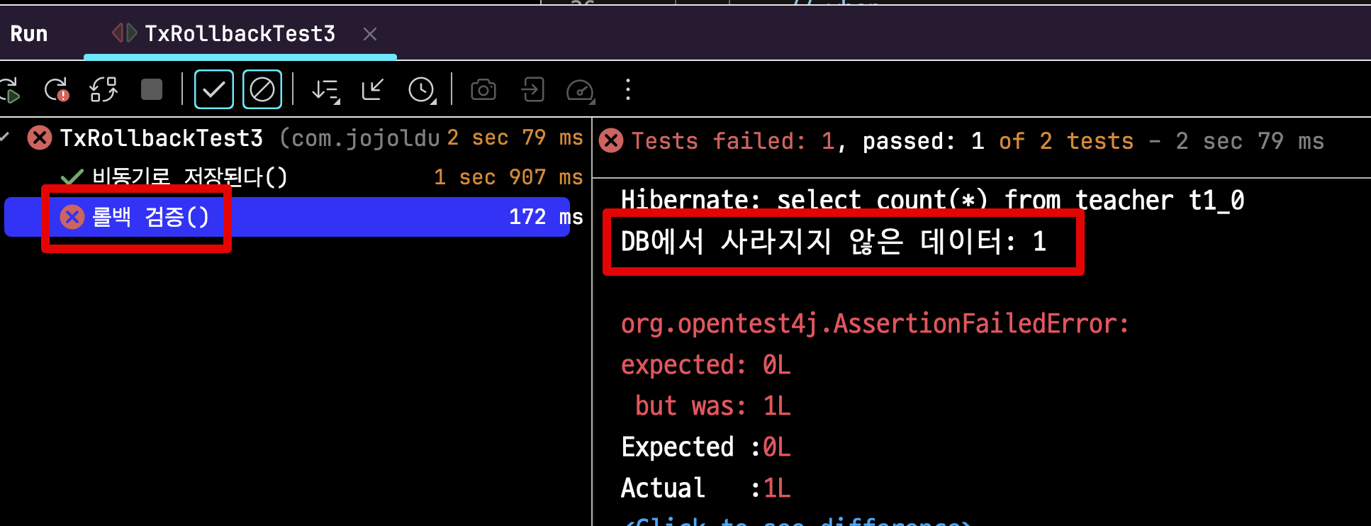 2-2. 트랜잭션 전파 속성을 조절한 테스트 롤백 실패